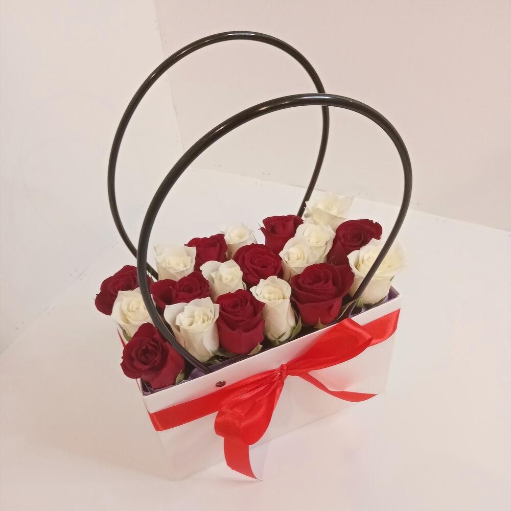 роза кения микс – 19 шт.Флористический оазис – 1 шт.Сумочка – 1 шт.