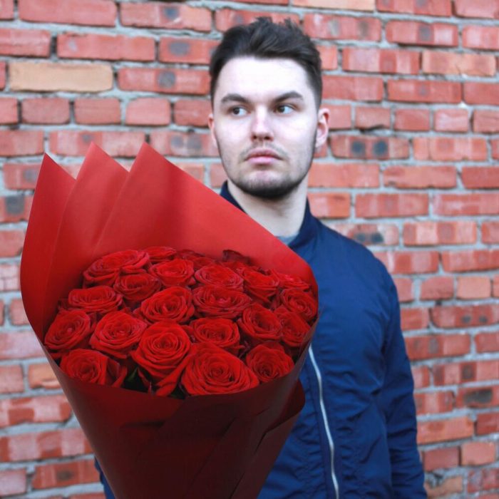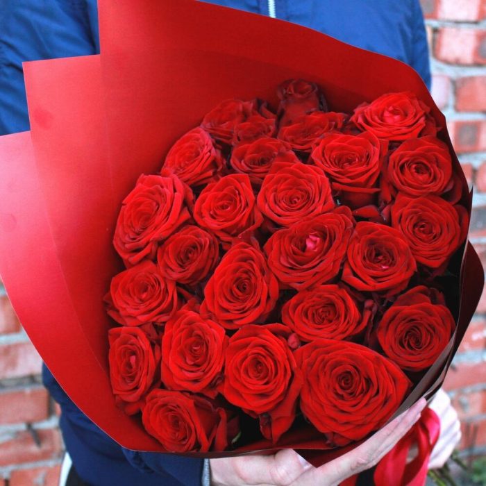 Роза красная – 25 шт.Лента атласная – 1 шт.упаковочный материал – 2 шт.