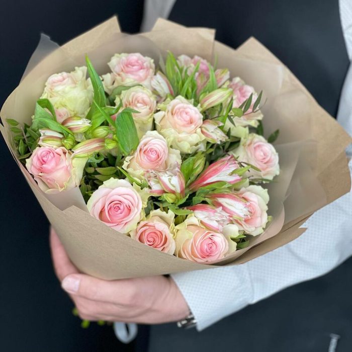Роза – 15 шт.Альстромерия – 3 шт.Крафт – 3 шт.