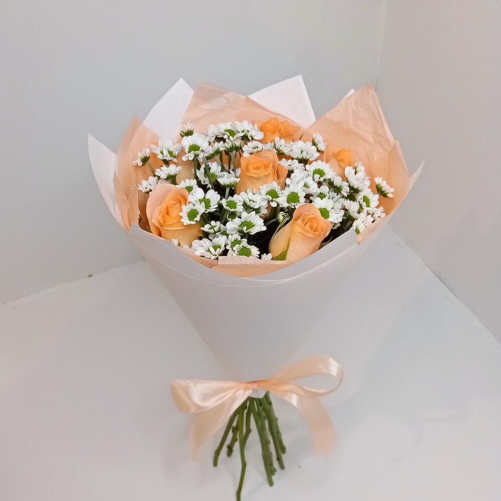 роза кения – 6 шт.Хризантема кустовая Сантини – 3 шт.Дизайнерская упаковка – 1 шт.