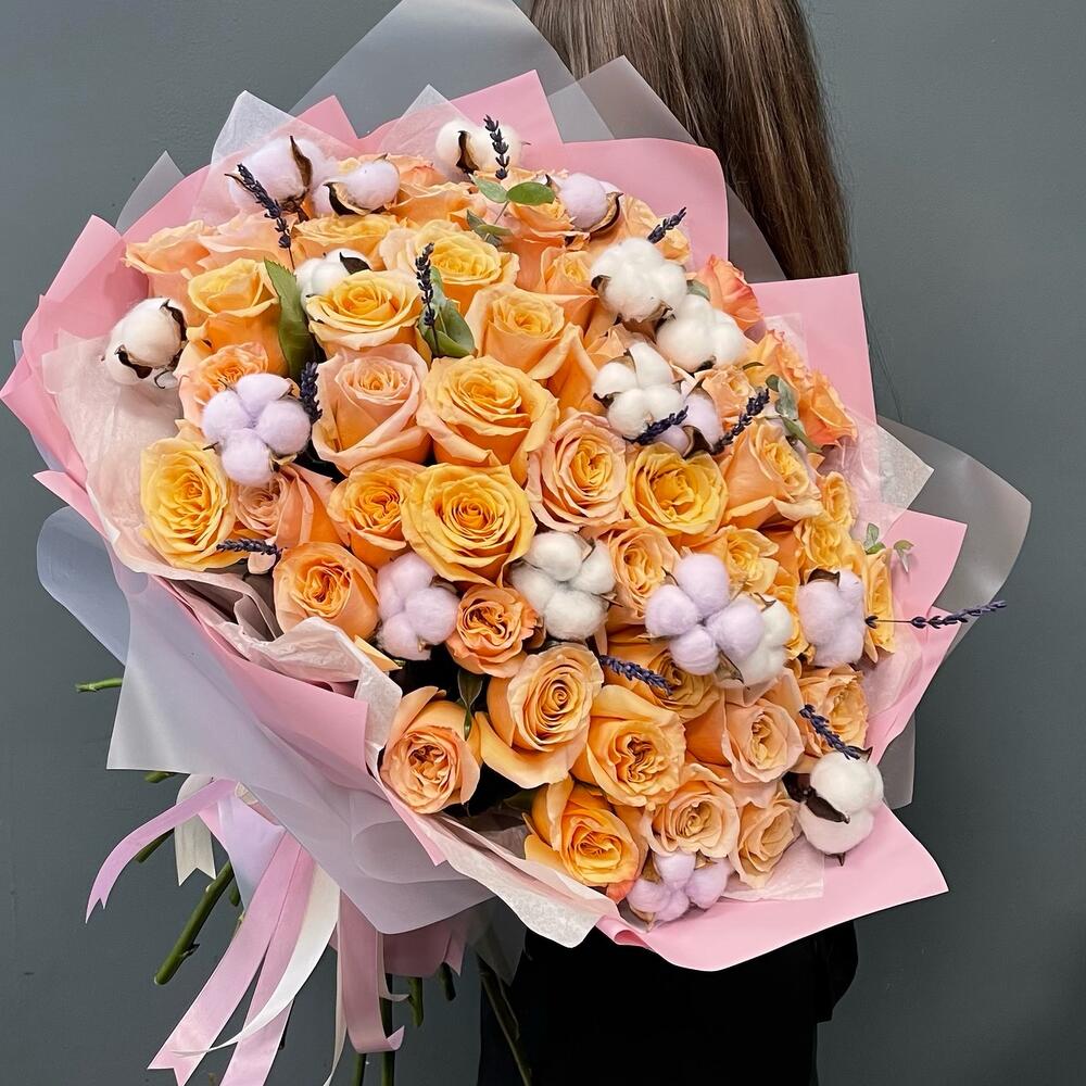 Лаванда – 11 шт.Хлопок – 20 шт.Эвкалипт – 3 шт.Роза одноголовая – 49 шт.Лента атласная – 3 шт.Упаковка дизайнерская – 2 шт.