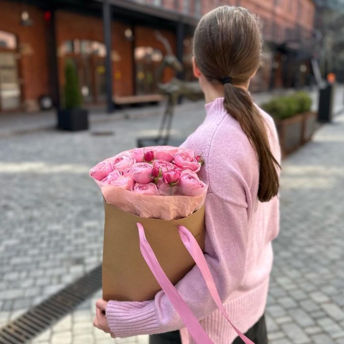 Лента атласная – 1 шт.Роза пионовидная кустовая – 5 шт.Пленка матовая – 1 шт.Крафт жатый – 1 шт.Пакет крафтовый – 1 шт.