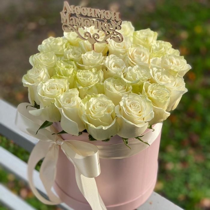 Роза Мондиаль – 25 шт.Коробка шляпная – 1 шт.Топпер маме – 1 шт.бант атласный – 1 шт.