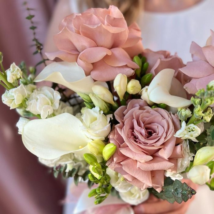 Пионовидная роза – 5 шт.Маттиола – 5 шт.Фрезия – 5 шт.Калла – 3 шт.Лизиантус – 5 шт.Эвкалипт – 3 шт.Атласная лента – 1 шт.