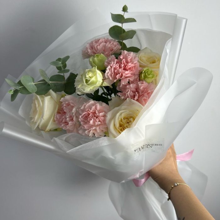 Авторский букет "Маленькая нежность": пионовидная роза, нежная гвоздика и ароматная маттиола