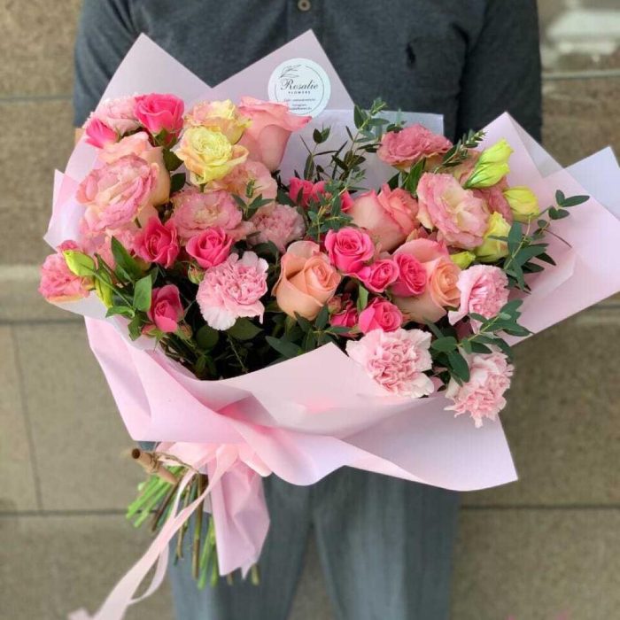 Гвоздики, Лизиантусы, Розы, Тюльпаны