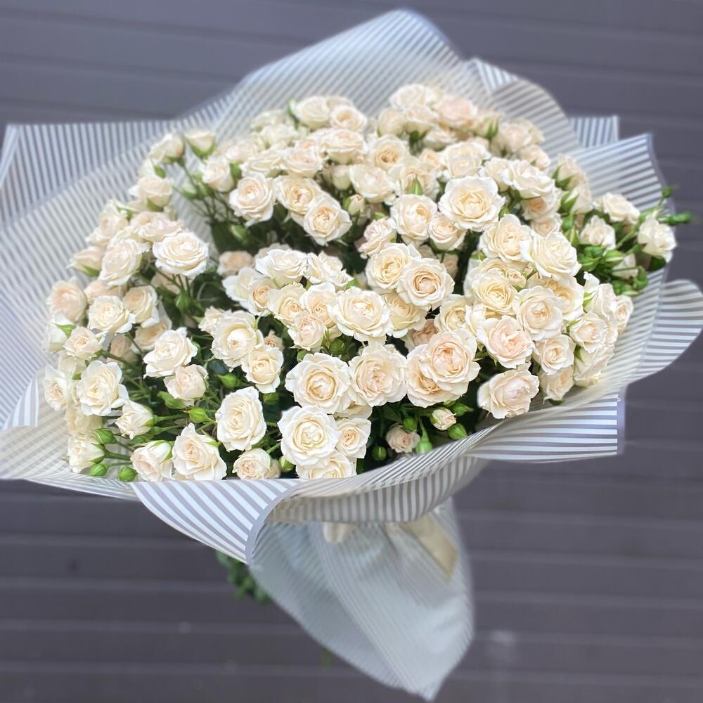 Лента атласная – 1 шт.Упаковка дизайнерская – 1 шт.кустовая роза крем грация 60 см – 25 шт.
