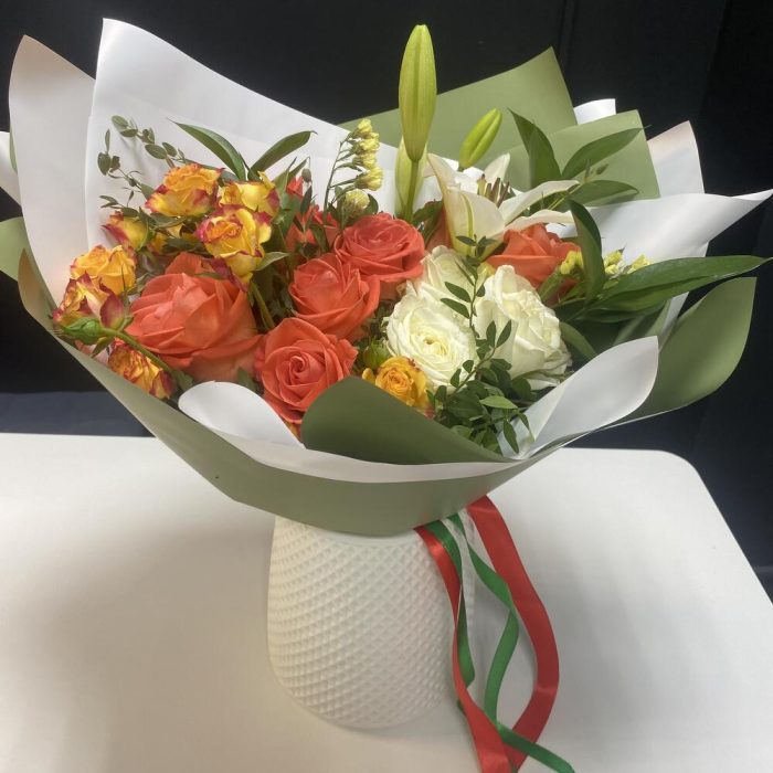 Роза Вау – 8 шт.Роза Аваланж – 3 шт.Роза кустовая – 1 шт.Статица желтая – 2 шт.зелень фисташи – 2 шт.Рускус – 3 шт.Пленка корейская – 2 шт.Лента атласная – 2 шт.Лилия – 1 шт.