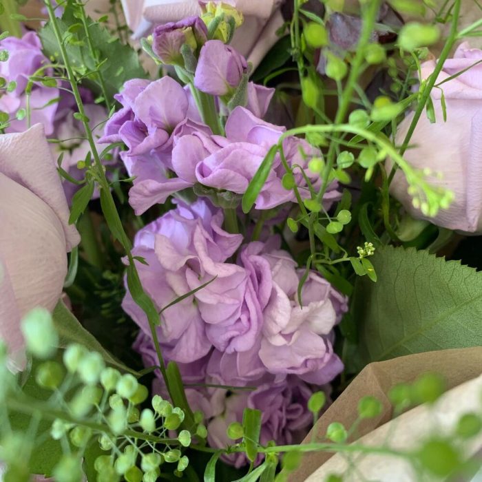Роза оушен сонг – 5 шт.Фритиллярия – 3 шт.Таласпи – 1 шт.Маттиола – 2 шт.Упаковка дизайнерская – 1 шт.