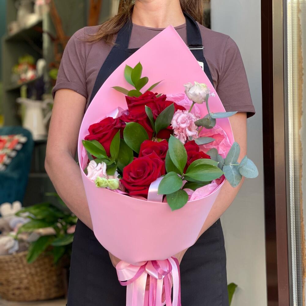 Лента – 1 шт.Лизиантус – 2 шт.Рускус – 5 шт.Эвкалипт – 1 шт.Роза одноголовая – 7 шт.Упаковка – 1 шт.
