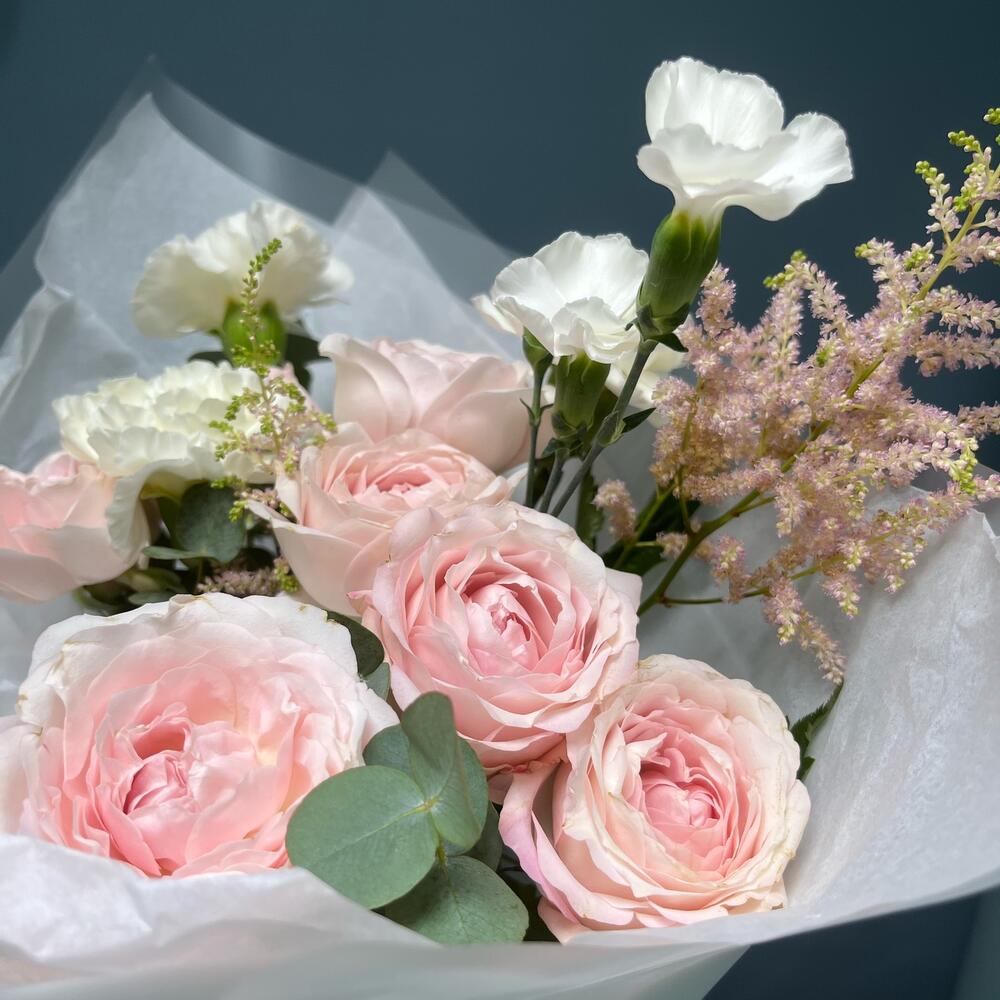 Астильба – 2 шт.Роза кустовая – 2 шт.Эвкалипт – 2 шт.Гвоздика – 3 шт.Лента атласная – 1 шт.Тишью – 1 шт.Кустовая гвоздика – 1 шт.Упаковка дизайнерская – 2 шт.