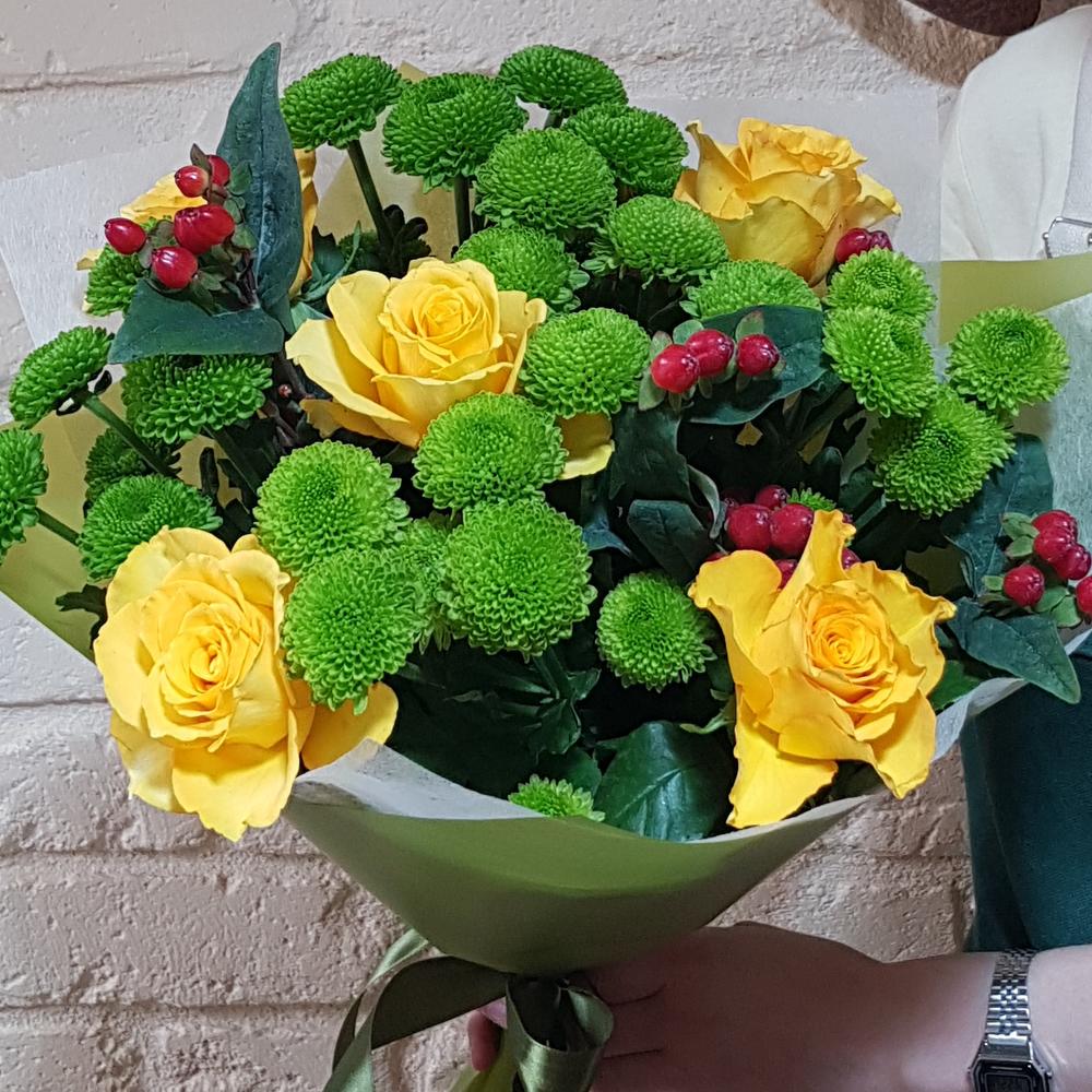 Букет в желто-зеленых тонах для тех, кто любит все естественное. Букет обернут натуральным крафтом в таких же тонах. Все вместо симфолизирует близость к природе. К подарку обычно прикладывается наша карточка с красиво напечатанным текстом вашего послания. К букетам обычно прилагается рекомендация по уходу и объяснением причин. При доставке температура в машине курьера контролируется нами в зависимости от сезона.