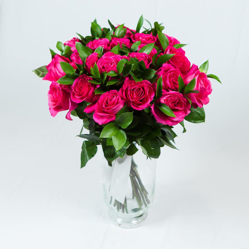 роза розовая эквадор 60 см – 25 шт.Рускус сочи – 9 шт.Лента атласная – 1 шт.
