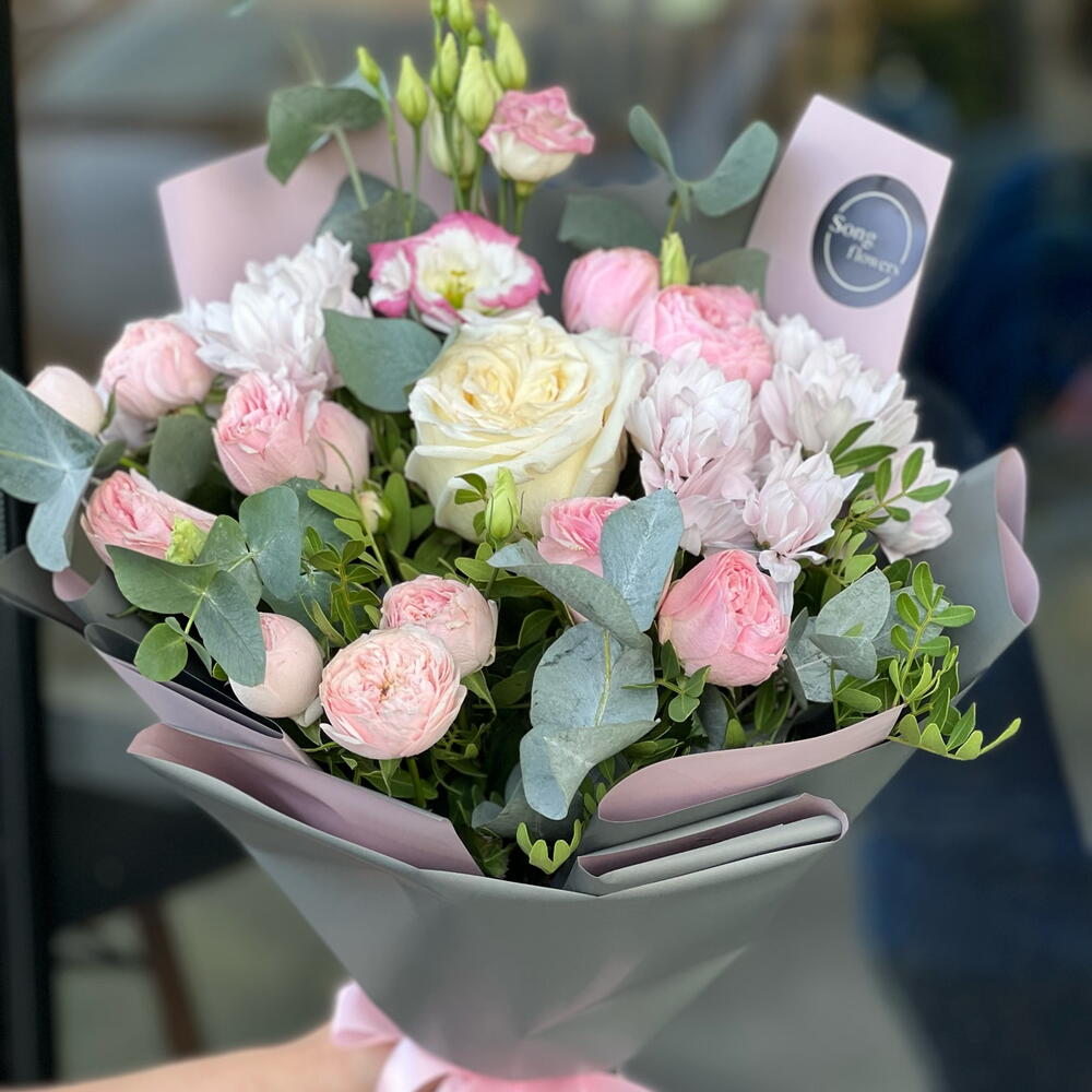 Гвоздики, Лизиантусы, Розы, Тюльпаны