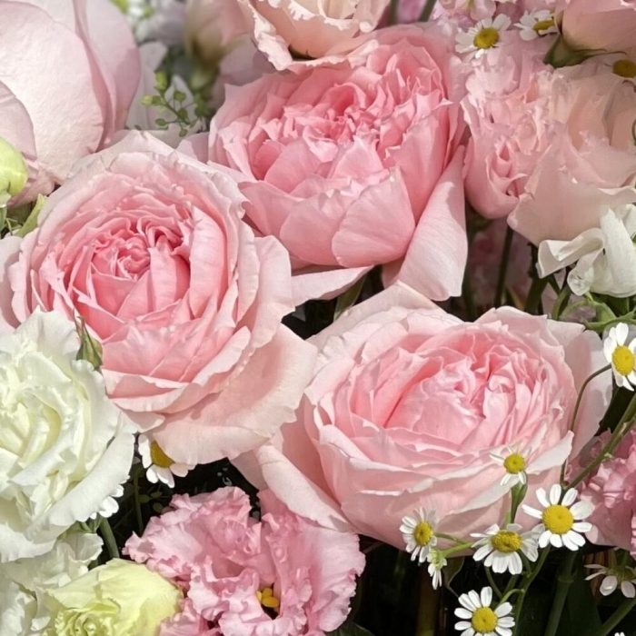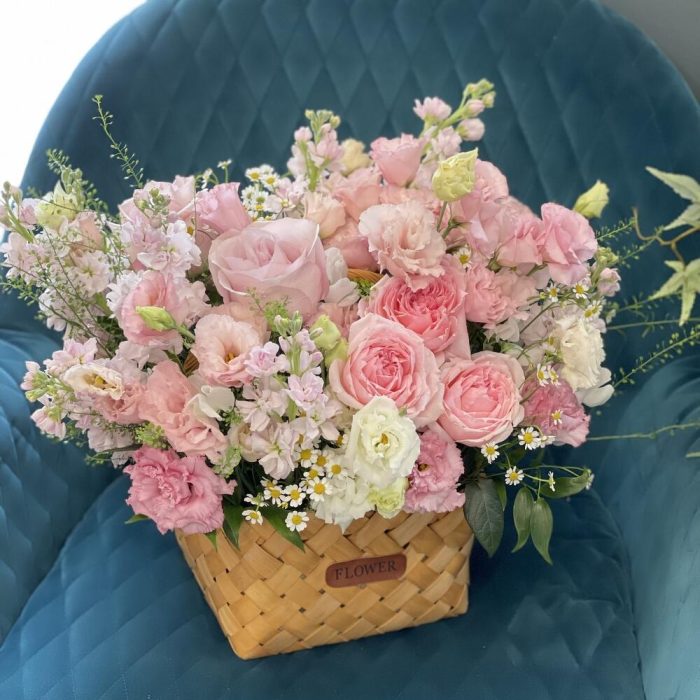 Лизиантус – 5 шт.Роза одноголовая – 5 шт.Роза пионовидная кустовая – 3 шт.Матрикария – 2 шт.Корзина плетеная – 1 шт.Маттиола белая – 8 шт.Оазис флористический – 1 шт.