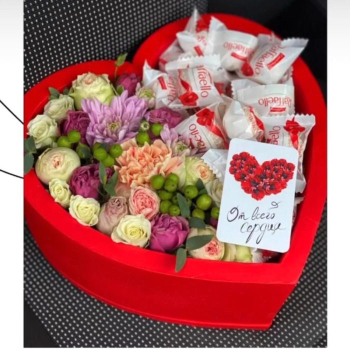 “Сладкое сердце ” – цветочная композиция с сладостями в коробке “Сердце”
