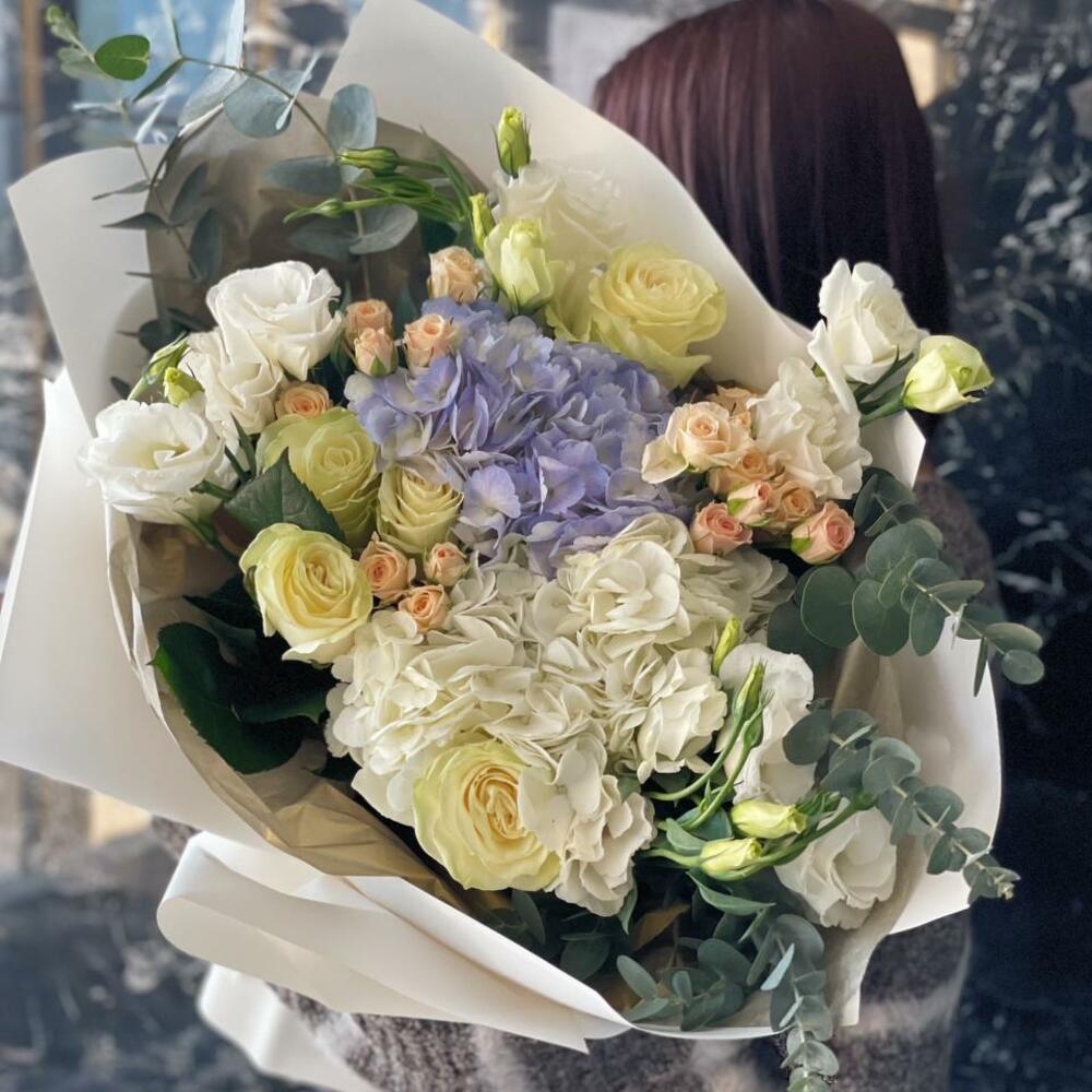 Бело-зелёный букет с розой мондиаль, эвкалиптом и лизиантусом
