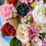 Лента атласная – 1 шт.Упаковка пленка – 1 шт.эустома розовая – 4 шт.Пионовидная роза кустовая – 3 шт.Оазис флористический – 1 шт.фисташка зелень – 3 шт.коробка шляпная брендированная – 1 шт.Клубника – 50 гр.рожки вафельные – 5 шт.аллиум белый (мини) – 2 шт.пионоивдная роза ароматная – 3 шт.даинутс – 3 шт.Голубика – 50 гр.Малина – 50 гр.