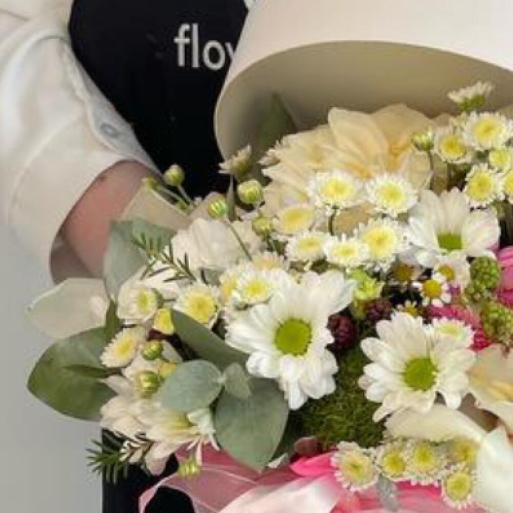 Цветы в коробке с хризантемами