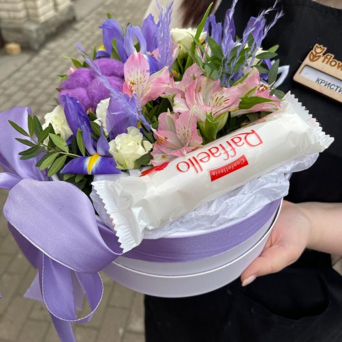 Коробка – 1 шт.Оазис флористический – 1 шт.Ирис – 3 шт.Хлопок – 1 шт.Альстромерия – 1 шт.Роза кустовая – 2 шт.Фисташка – 1 шт.Конфеты Raffaello – 1 шт.