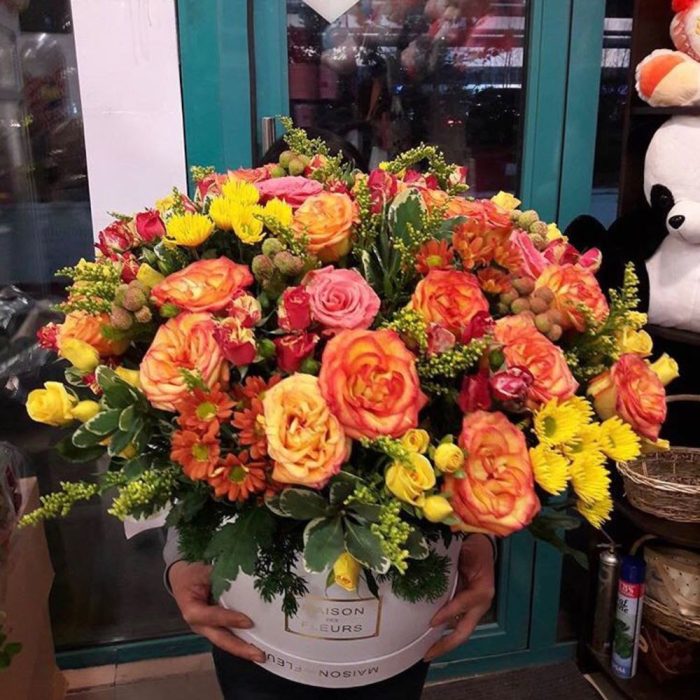 Хризантема кустовая – 5 шт. Зелень – 7 шт. Шляпная коробка – 1 шт. Роза одноголовая местная 60 см – 7 шт. Хризантема сантинии – 5 шт. Роза кустовая местная – 6 шт.