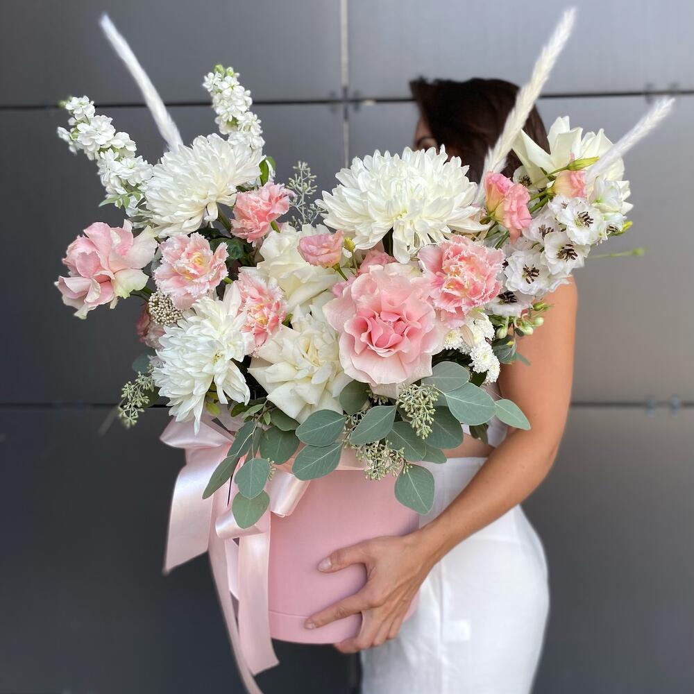 Французские жемчужные розы с ароматным эвкалиптом в шляпной коробке