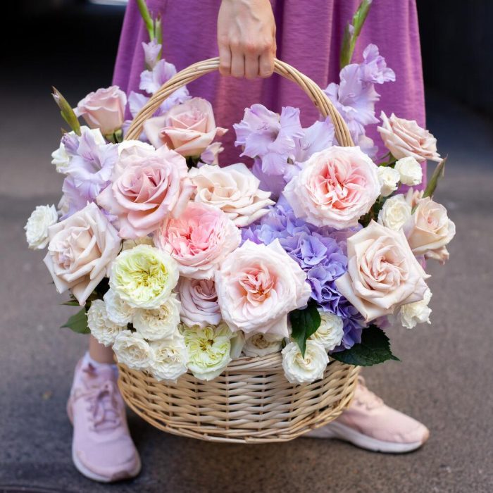 Роза пионовидная – 6 шт.Роза – 8 шт.Диантус – 9 шт.Гортензия – 1 шт.Гладиолус – 4 шт.Роза кустовая – 4 шт.Лизиантус – 3 шт.зелень микс – 3 шт.цветы микс – 4 шт.Корзина – 1 шт.