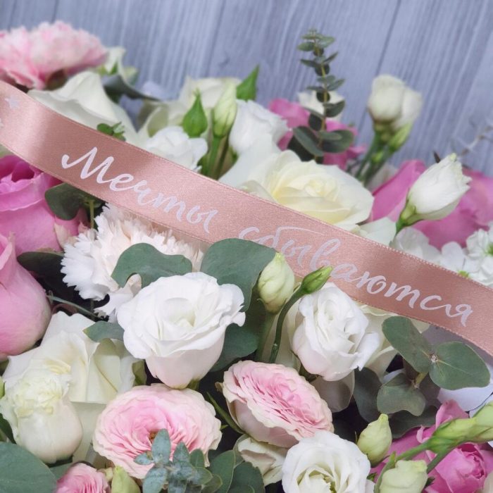 Лента атласная – 3 шт.Корзина плетеная большая – 1 шт.Маттиола белая – 3 шт.Роза белая 50 см – 16 шт.Оазис флористический – 3 шт.Роза розовая 50 см – 19 шт.эустома белая – 7 шт.Эвкалипт Baby Blue – 5 шт.Роза кустовая белая 50 см – 3 шт.гвоздика белая сортовая – 5 шт.роза кустовая розовая пионовидная – 4 шт.гвоздика розовая диантус – 6 шт.октрытка ручной работы – 1 шт.