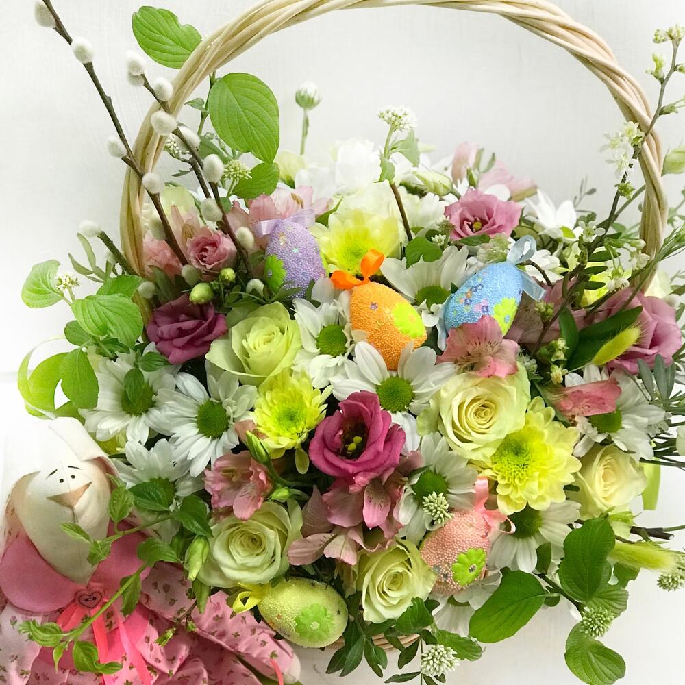 ромашки кустовые – 15 шт.Хризантема кустовая – 11 шт.Роза – 7 шт.зелень декоративная – 15 шт.Верба – 9 шт.яйцо декоративное – 5 шт.корщина плетеная – 1 шт.Оазис флористический – 1 шт.Лента атласная – 2 шт.работа флориста – 1 шт.