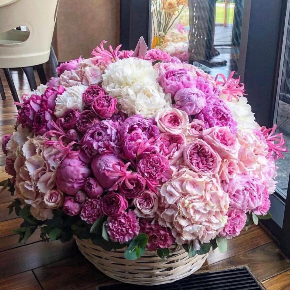 Корзина с пионами,маттиолой и пионовидными розами