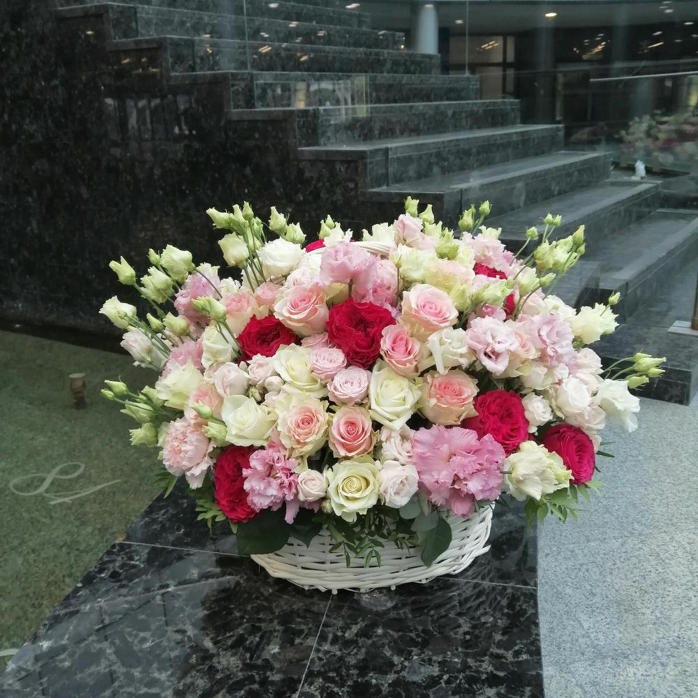Роза – 25 шт.Роза кустовая – 17 шт.Роза пионовидная – 10 шт.Эустома – 10 шт.Гвоздика – 10 шт.Эвкалипт – 15 шт.Корзина – 1 шт.Оазис – 2 шт.