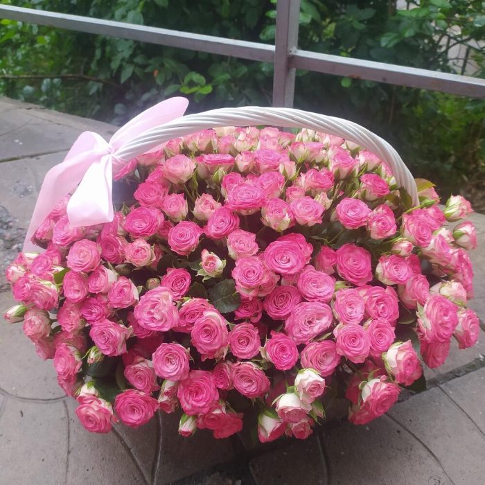 Роза кустовая – 81 шт.Корзина плетеная – 1 шт.Оазис флористический – 2 шт.бант атласный – 1 шт.