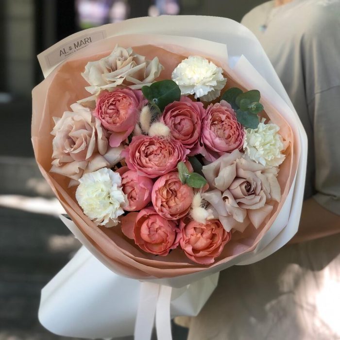 Авторский букет "Маленькая нежность": пионовидная роза, нежная гвоздика и ароматная маттиола