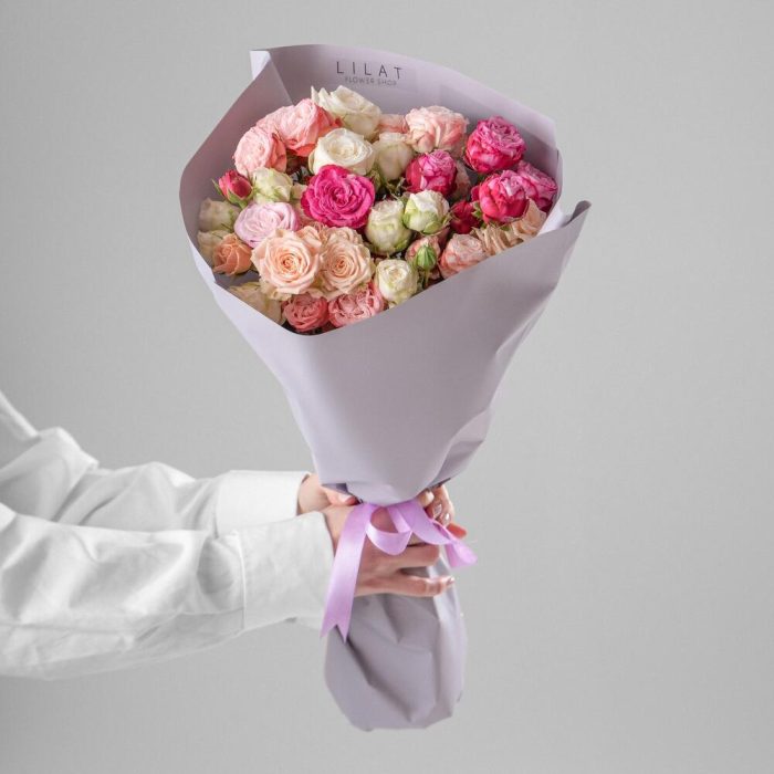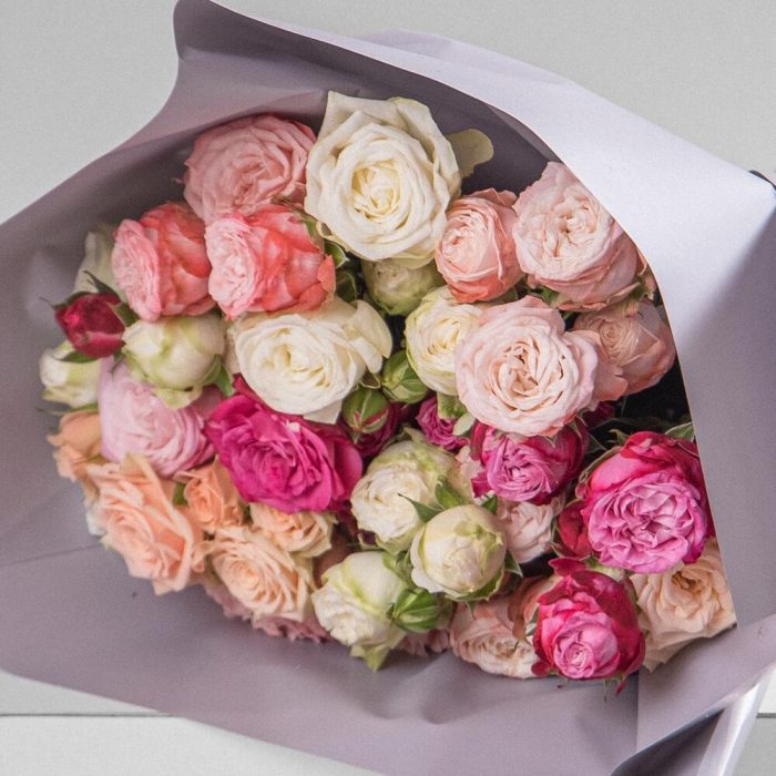 Кустовая пионовидная роза – 21 шт. Дизайнерская упаковка – 1 шт. Открыточка с вашими пожеланиями – 1 шт.