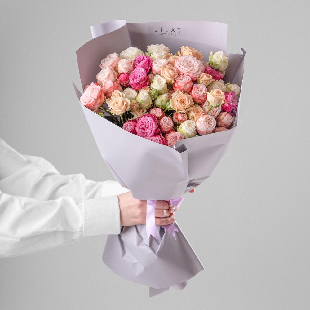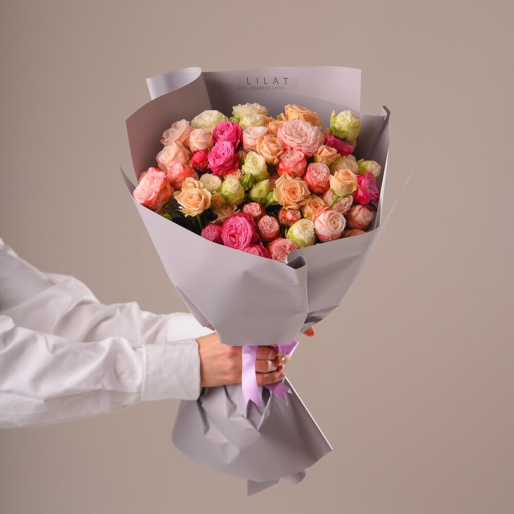 кустовые пионовидные розы – 31 шт. Дизайнерская упаковка – 3 шт. Открытка – 1 шт.