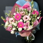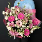 Роза – 9 шт.Лизиантус – 3 шт.Гербера мини – 7 шт.Упаковка дизайнерская – 3 шт.