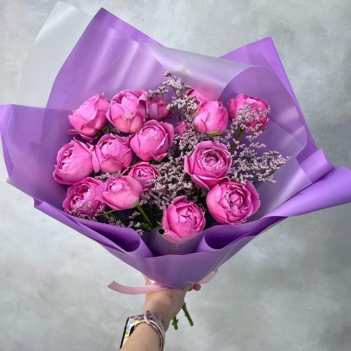 Лимониум – 2 шт.Лента атласная – 1 шт.Роза кустовая пионовидная – 5 шт.Упаковка пленка матовая – 2 шт.