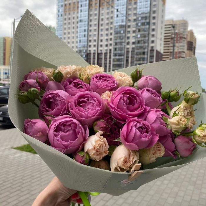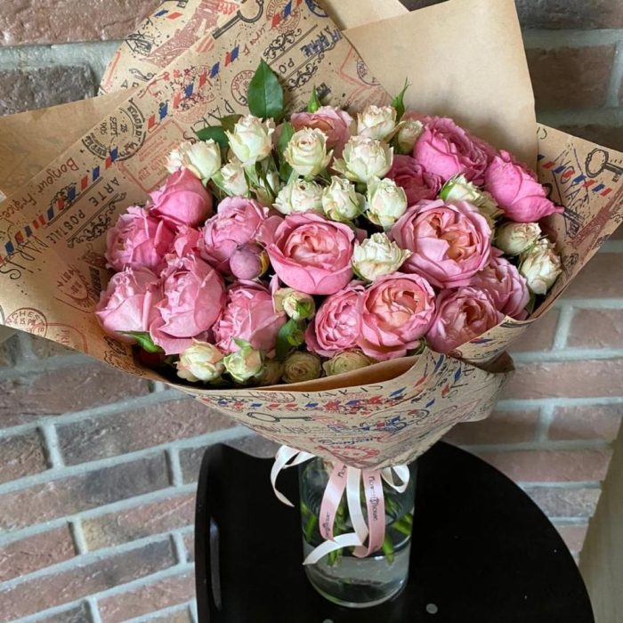 Лента – 2 шт.Крафт упаковка – 1 шт.пионовидная кустовая роза 40-50 см – 9 шт.