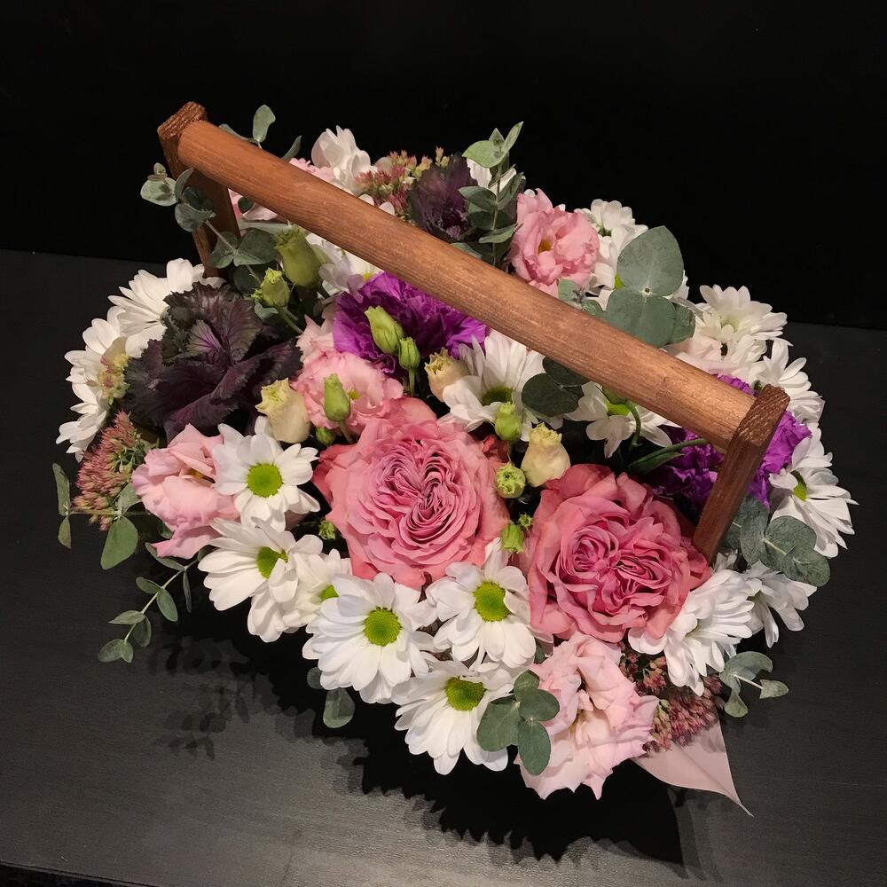Ящик деревянный – 1 шт.Оазис флористический – 1 шт.Пленка матовая – 1 шт.Роза пионовидная – 2 шт.Брассика фиолетовая – 2 шт.эустома розовая махровая – 2 шт.Хризантема кустовая – 3 шт.Очиток – 3 шт.Диантус лунный – 2 шт.Эвкалипт – 3 шт.