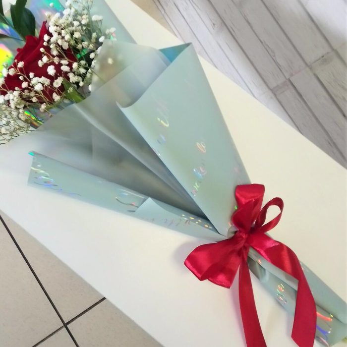 Роза – 1 шт.Гипсофила – 1 шт.Рускус Израиль – 1 шт.пленка флористическая – 2 шт.Лента атласная – 1 шт.