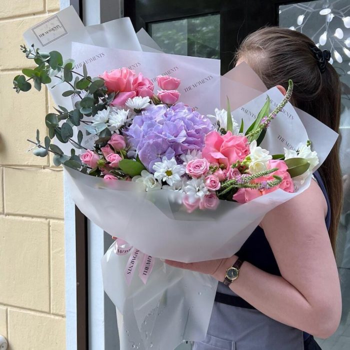 Авторский букет с ароматными розами и гортензией «Тайное влечение»