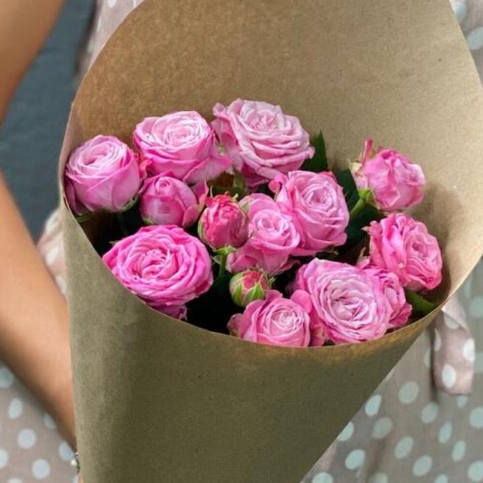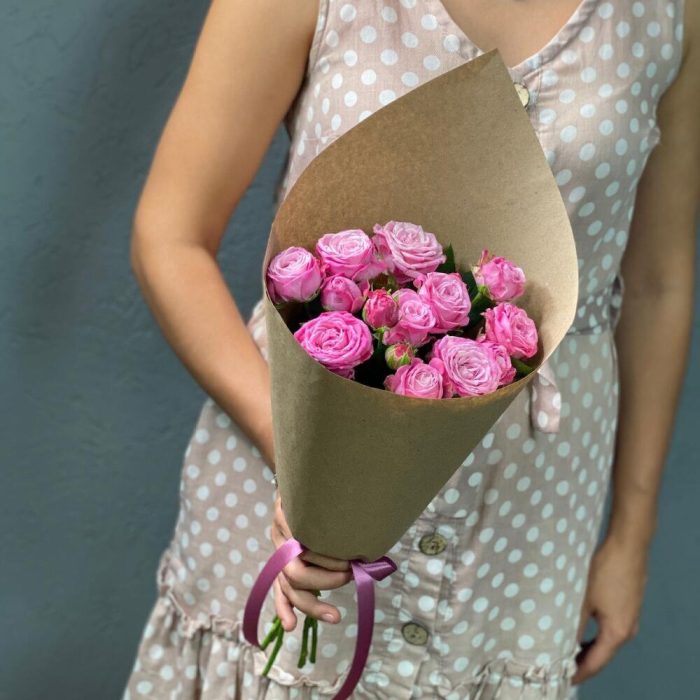 Пионовидная кустовая роза – 5 шт. Открыточка с вашими пожеланиями – 1 шт. Упаковка дизайнерская – 1 шт.