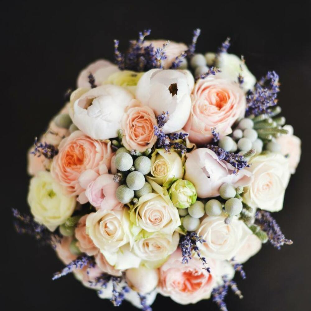 Пионовидная роза – 9 шт.Кустовая роза – 5 шт.Ранункулюс – 7 шт.Бруния – 3 шт.Лаванда – 30 шт.Тюльпан – 4 шт.Лента атласная – 1 шт.Лента бархатная – 1 шт.