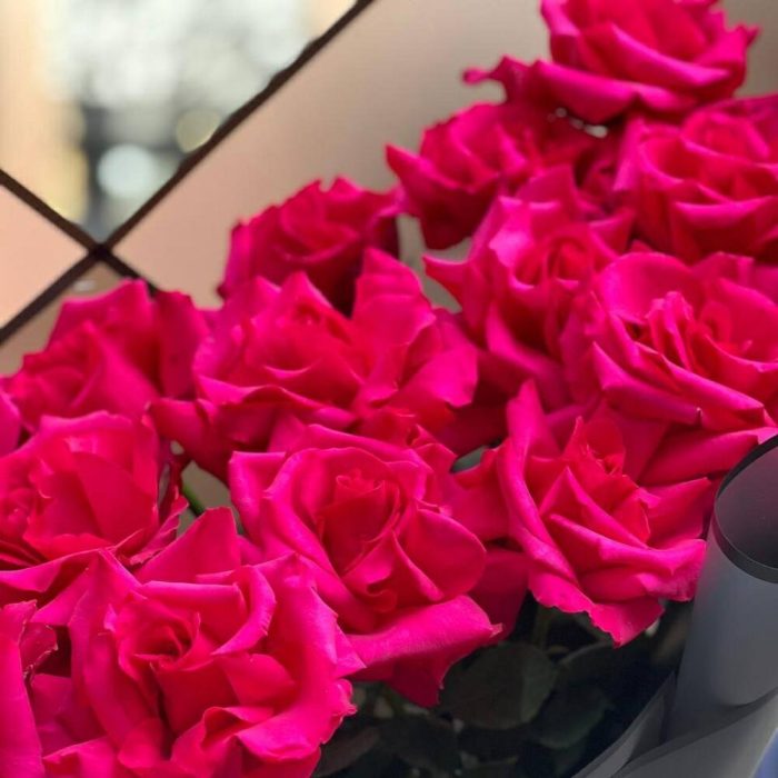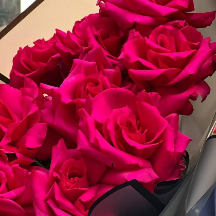 Роскошный букет из малиновых роз сорта Hot Explorer в стильном черном оформлении даже самых стильных и искушённых не оставят равнодушными