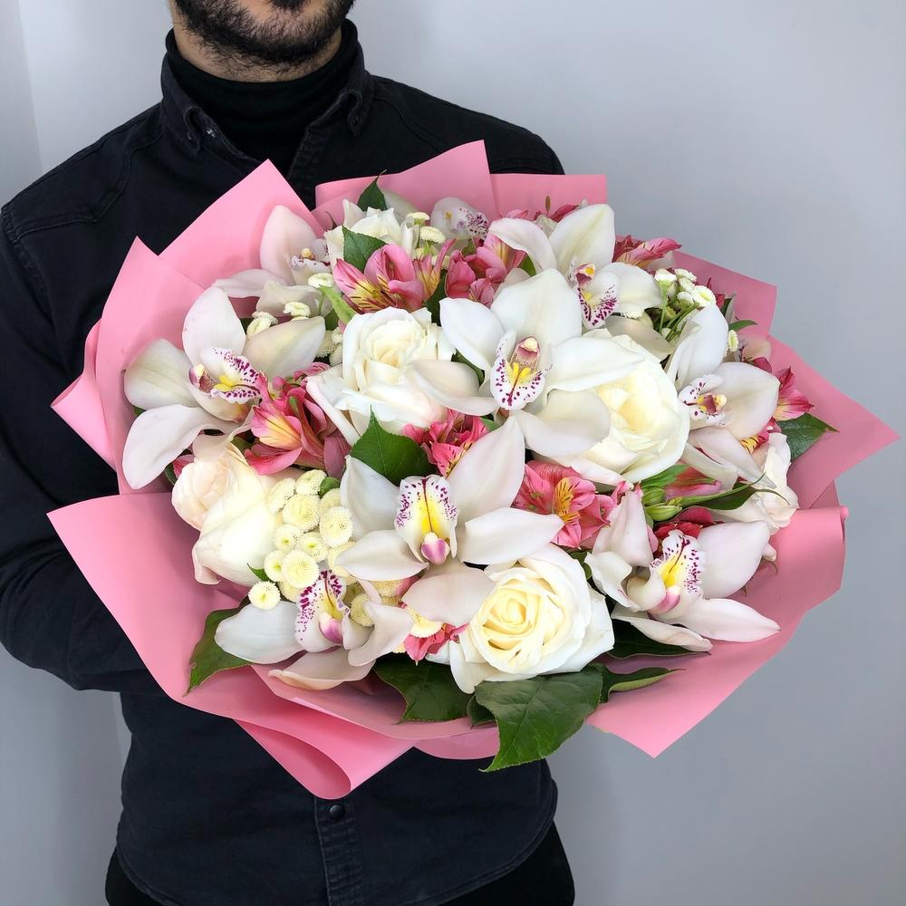 Орхидея Цимбидиум – 11 шт.Альстромерия – 7 шт.Роза – 7 шт.Хризантема кустовая – 3 шт.Зелень – 15 шт.Упаковка – 1 шт.