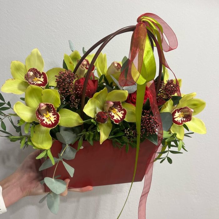 Писташ – 3 шт. Эвкалипт – 3 шт. Лента атласная – 1 шт. Скиммия – 3 шт. ЦИМБИДИУМ – 7 шт. Сумочка – 1 шт. Лента органза – 1 шт. биофлор – 1 шт. роза ред пиана пионовидная – 2 шт.