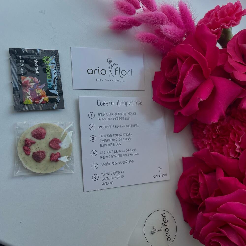 - Сроки возврата: Претензии по качеству букета принимаются в течение 24 часов с момента его получения.