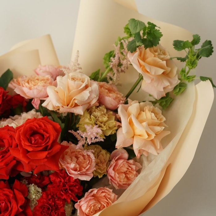 Роза французская – 10 шт.Роза кустовая джульетта – 2 шт.Астильба – 3 шт.Молюцелла – 2 шт.Гортензия – 1 шт.Диантус – 8 шт.Вибурнум – 2 шт.пампасная трава – 2 шт.Упаковка – 1 шт.
