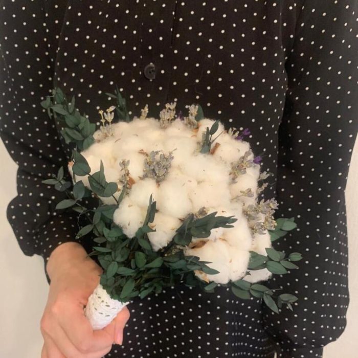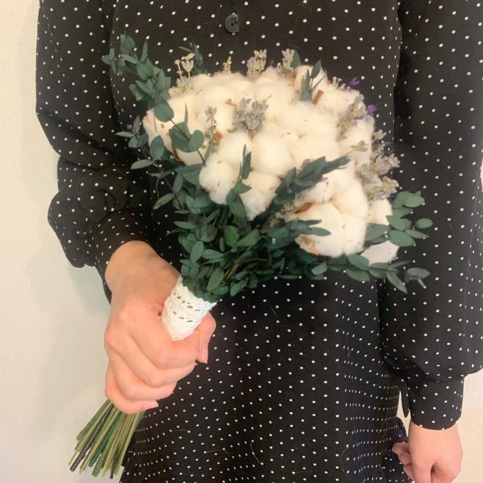 Хлопок натуральный – 19 шт.Эвкалипт стабилизированный – 5 шт.Лаванда (сухоцвет) – 30 шт.Кружево – 1 шт.бутоньерка для жениха – 1 шт.