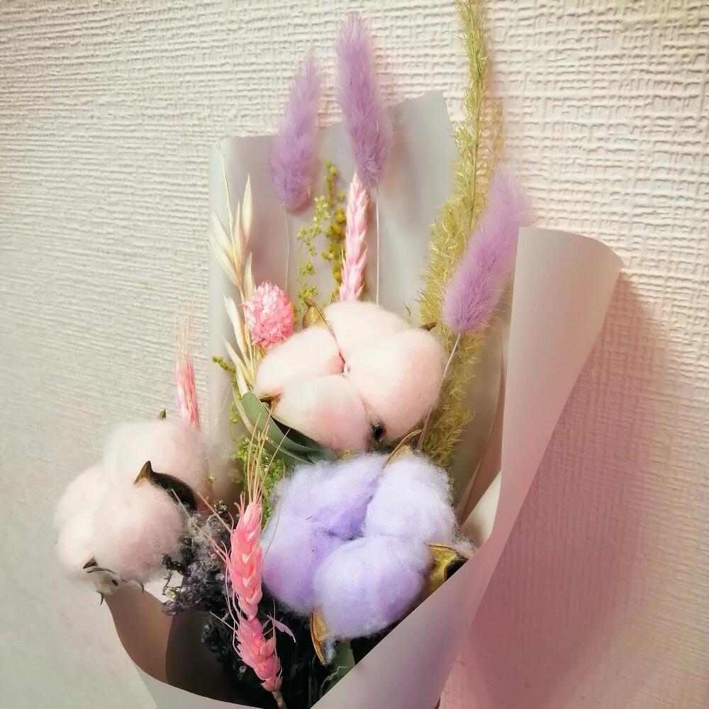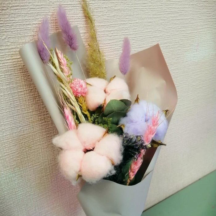 Хлопок натуральный – 3 шт.Пшеница (сухоцвет) – 3 шт.овес сухоцвет – 1 шт.Лагурус (сухоцвет) – 3 шт.Ковыль – 1 шт.зелень декоративная – 1 шт.Упаковка – 1 шт.
